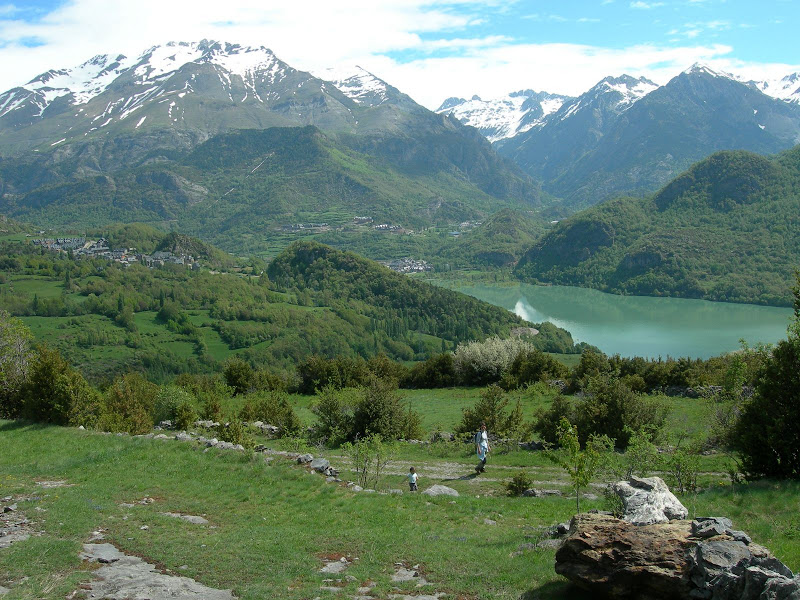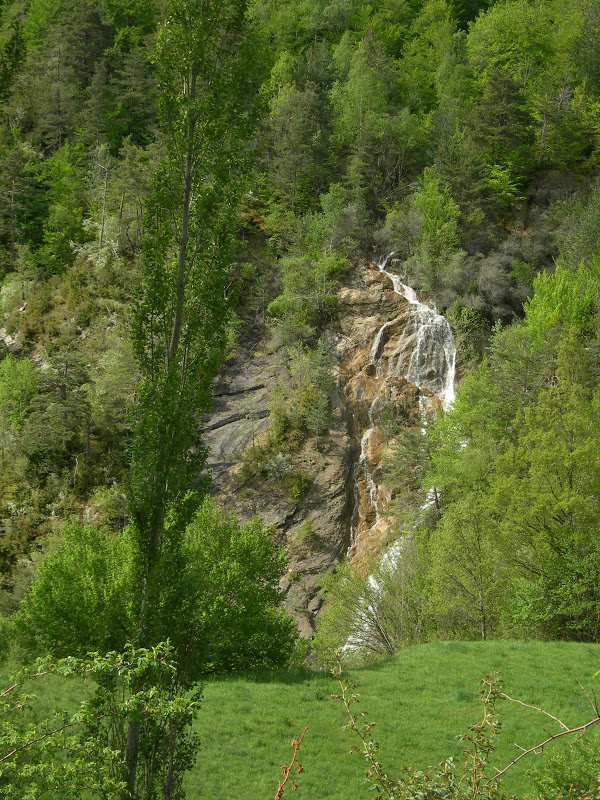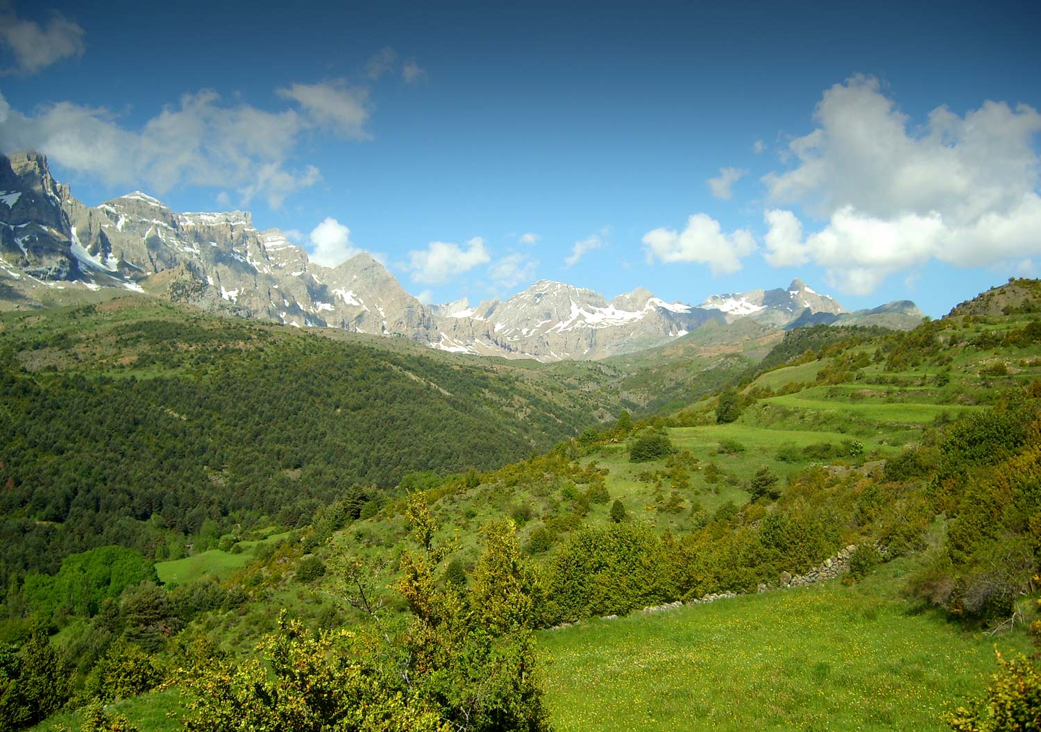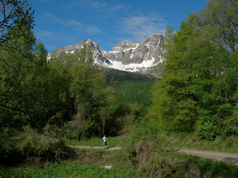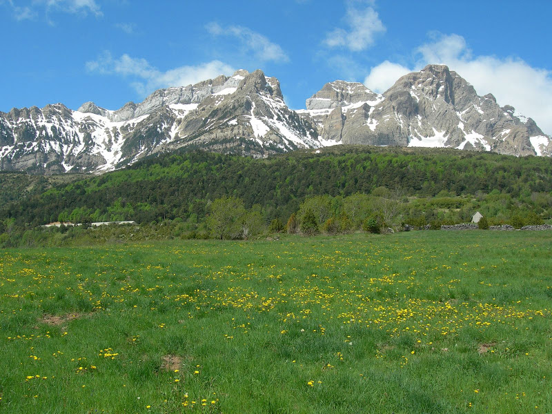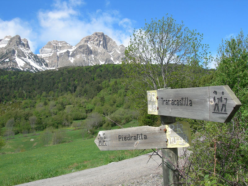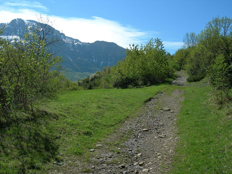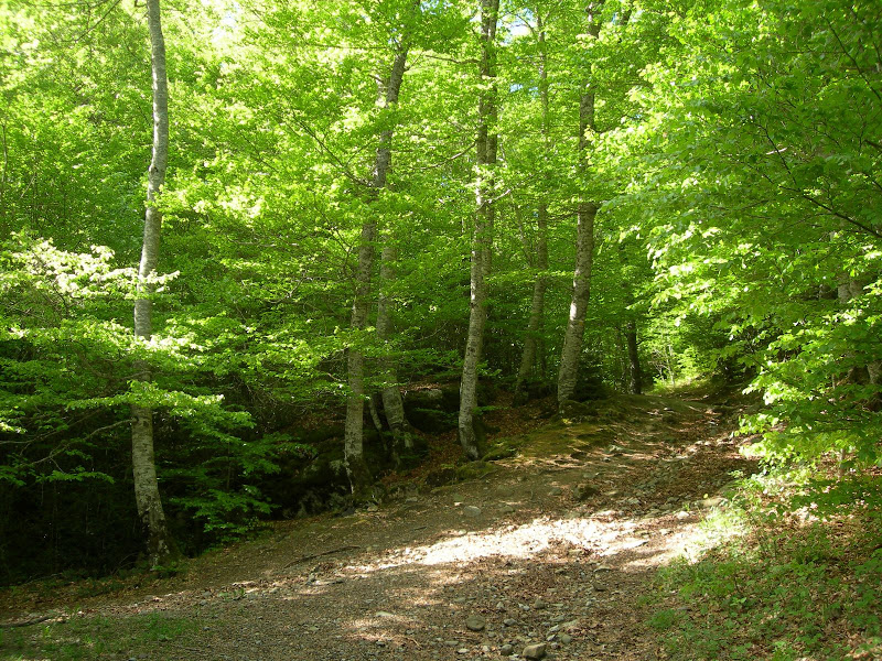 Un poco después de pasar el barranco de Gorgol, abandonamos la pista para adentrarnos por un bonito bosque de hayas cuyas hojas acaban de brotar y están de un verde casi fosforito. El sendero gana altura rápidamente hasta una bifurcación en el camino que nos envía al ibón de Piedrafita o hacia el propio pueblo. Nos vamos a este último atravesando unos claros en el bosque y sorteando algunos riachuelos hasta salir por encima del bosque a una zona de prados que queda justo por encima del pueblo de Piedrafita. El camino llega entonces a una pista asfaltada desde la que ya se ven abajo las casas de pueblo.